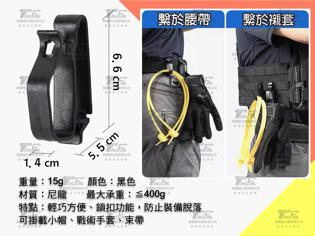 特點:輕巧方便、鎖扣功能,防止裝備脫落,可掛載小帽、戰術手套、束帶